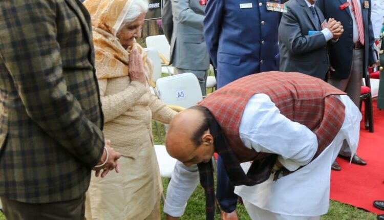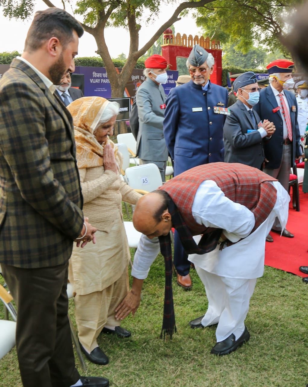Defence Minister Rajnath Singh met and touched the feet of Dhanno Devi, the wife of Colonel Hoshiar Singh, at Vijay Parv Samapan Samaroh in New Delhi today.