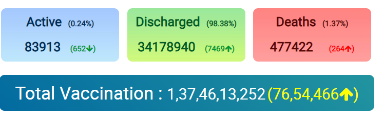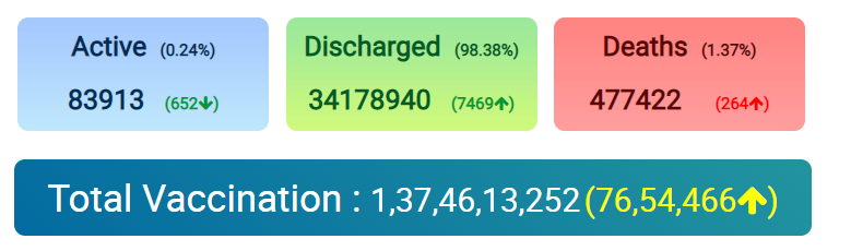 India reports 7,081 new #COVID19 cases, 7,469 recoveries, and 264 deaths in the last 24 hours. Nation By Editor Last updated Dec 19, 2021 50 Share Active cases: 83,913, lowest since March 2020Total recoveries: 3,41,78,940Death toll: 4,77,422Total Vaccination: 1,37,46,13,252 50 Share