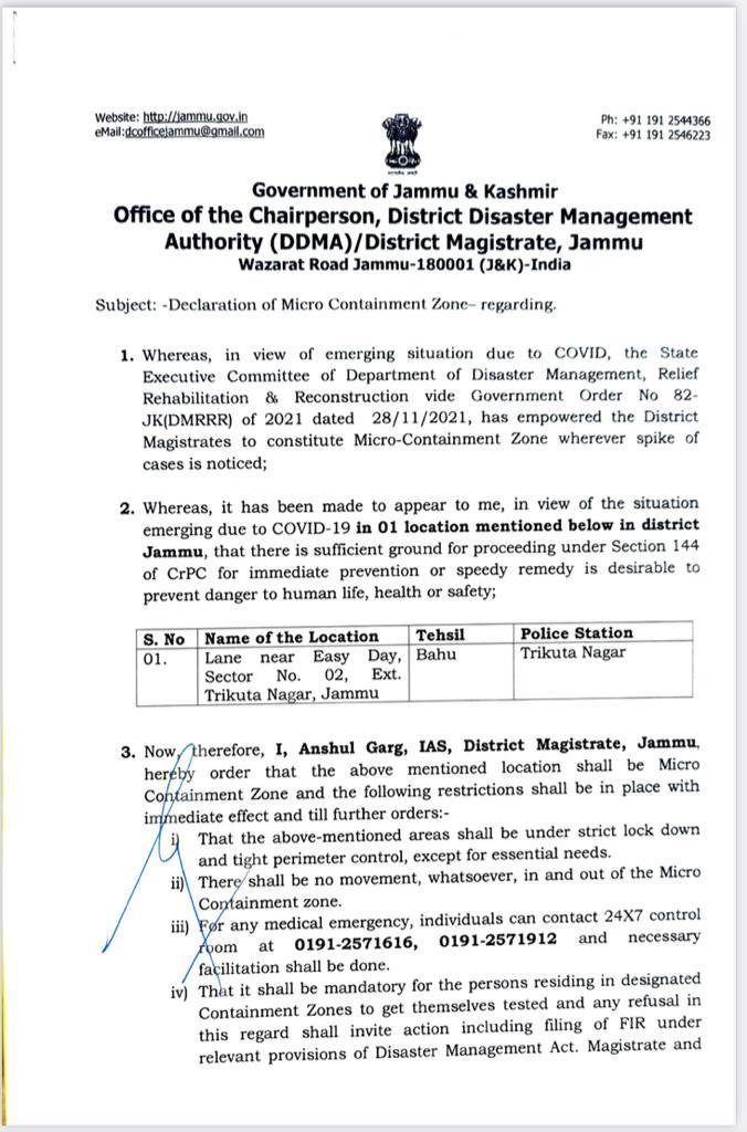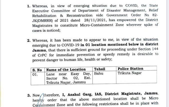 DC Jammu declared Lane near EasyDay Sector-2, Extn Trikuta Nagar, Jammu as Micro Containment Zone J&K / Ladakh By Editor Last updated Dec 21, 2021 90 Share 90 Share