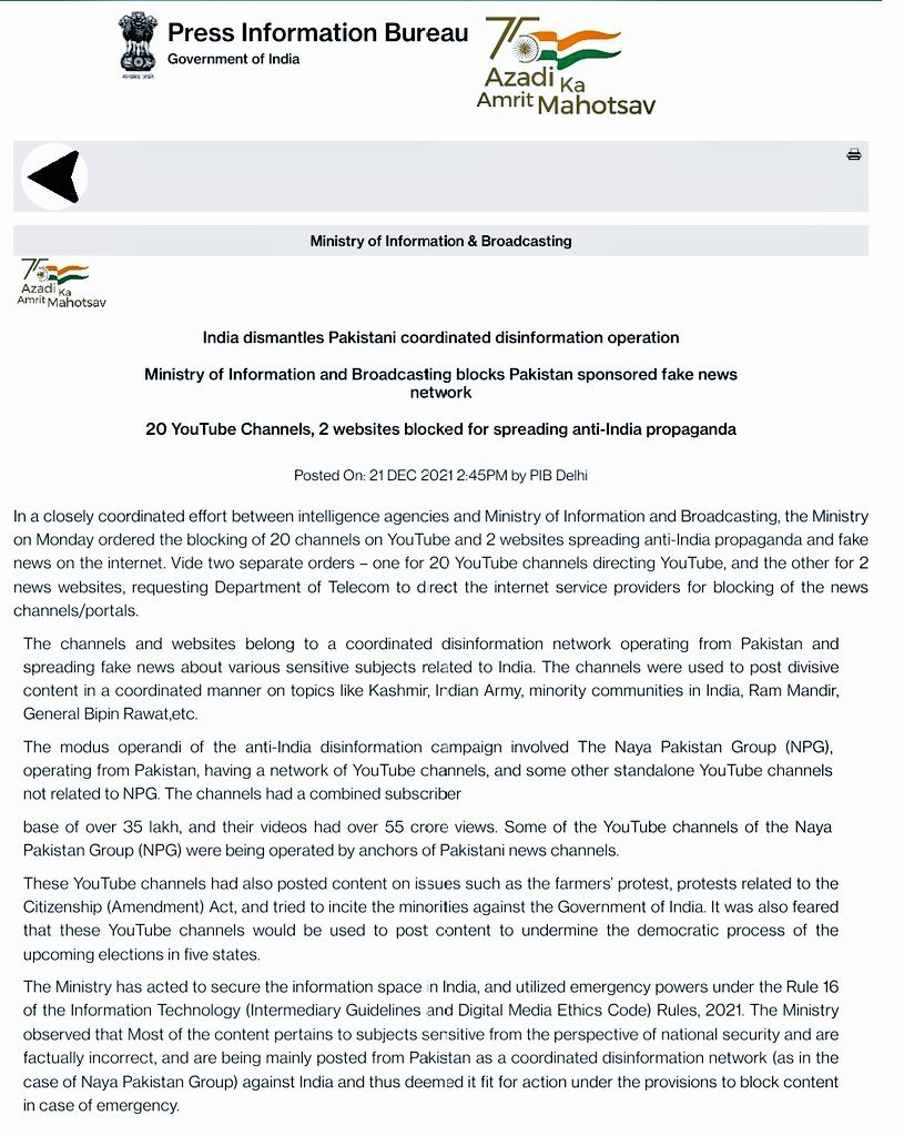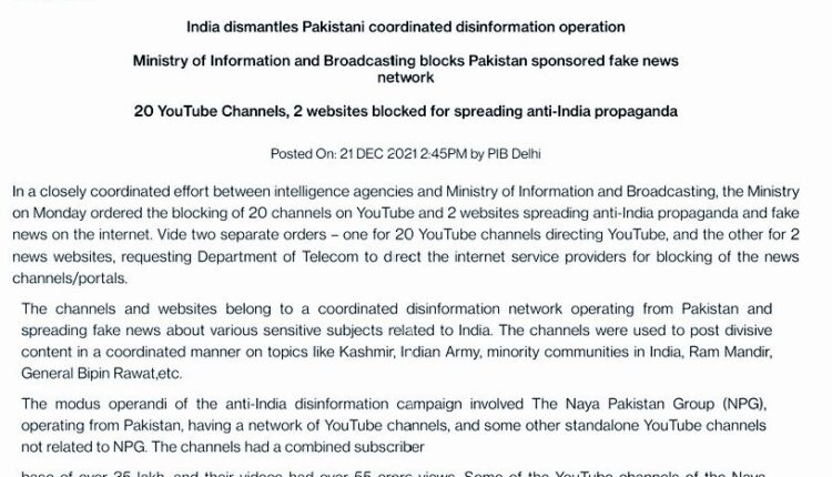 In a closely coordinated effort between intelligence agencies and Ministry of Information & Broadcasting, the Ministry on Monday ordered the blocking of 20 channels on YouTube and 2 websites spreading anti-India propaganda and fake news on the internet: Govt of India