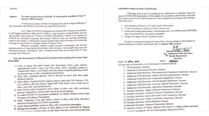 Govt of Haryana makes the second dose of #COVID19 vaccination mandatory from 1st January 2022. The State Govt decides to allow only fully vaccinated people at public places since that day. Only fully vaccinated persons will be allowed to travel from bus stands & railway stations.