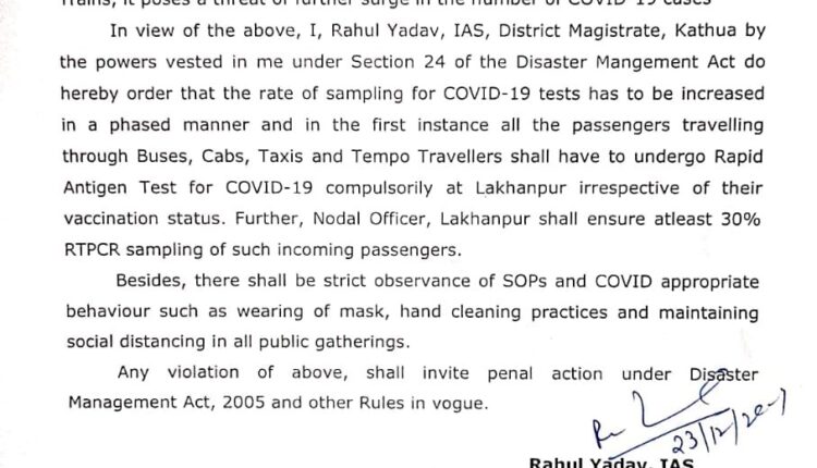 Testing of passengers coming by Buses, Cabs, Taxis, Tempo Travellers to undergo RAT test, 30% of passengers to undergo RTPCR testing at Lakhanpur