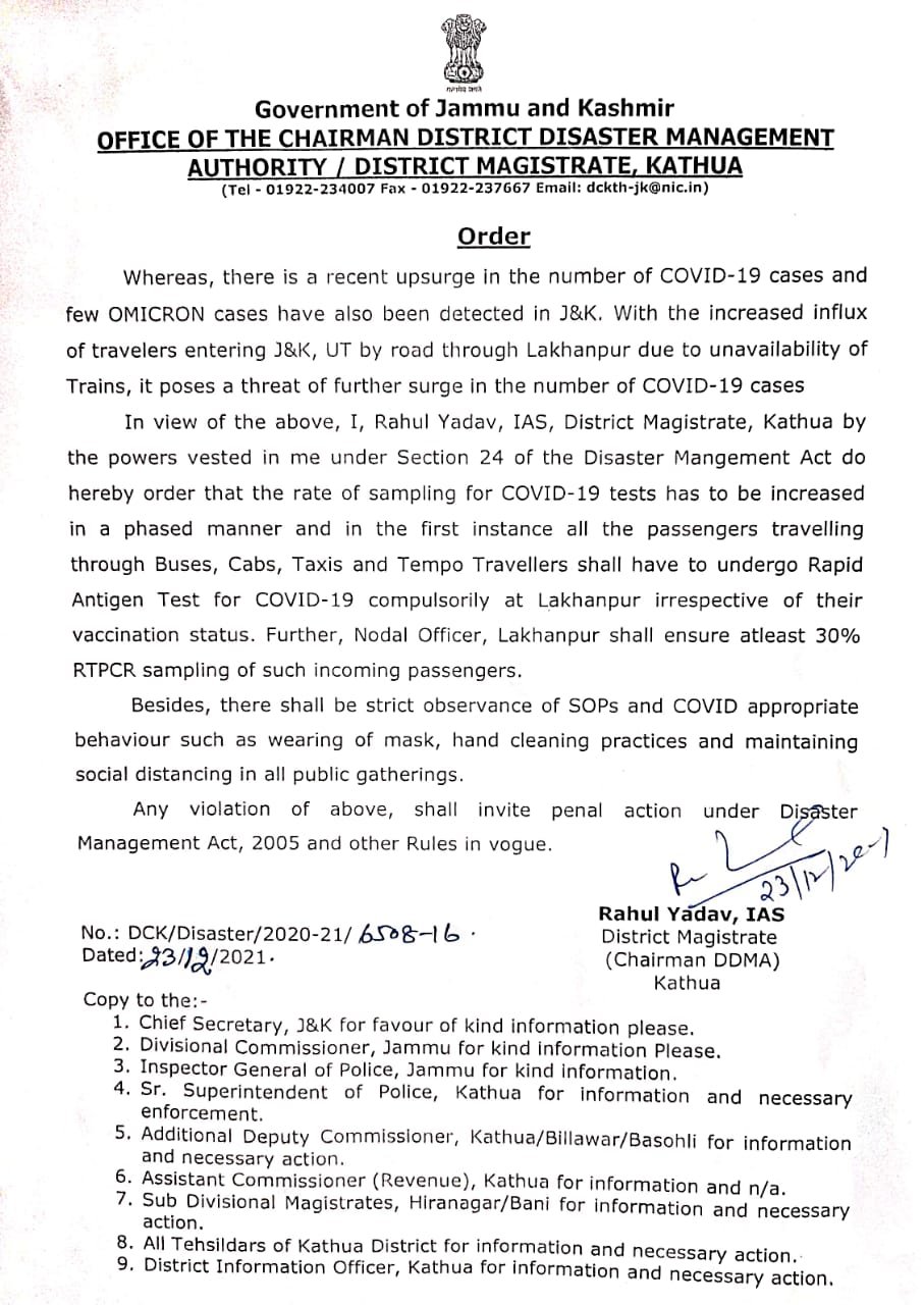 In view of OMICRON threat and due to increased influx of travellers, DC Kathua issues Order for fresh containment measures.