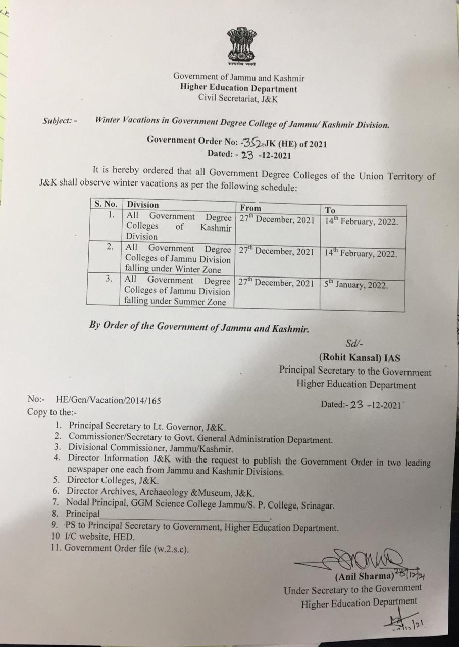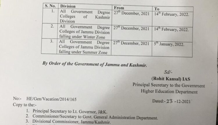 • Winter vacations for Govt Degree Colleges across J&K from Dec 27