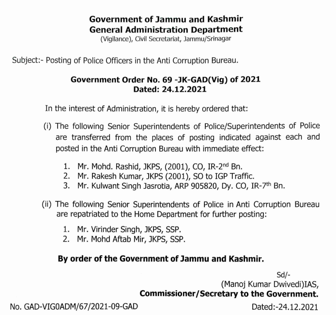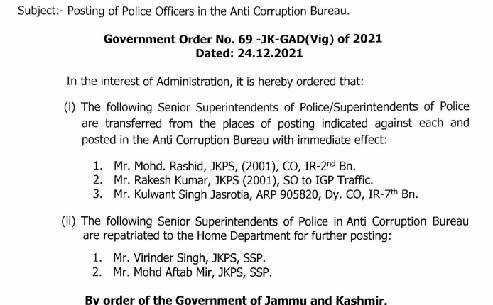 #JammuAndKashmir | Posting of Police Officers in the Anti Corruption Bureau J&K / Ladakh By Editor Last updated Dec 24, 2021 121 Share 121 Share