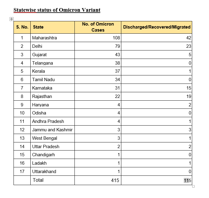 COVID19 | A total of 415 #Omicron cases were reported in 17 States/UTs of India so far. The number of persons recovered is 115: Union Health Ministry Nation By Editor Last updated Dec 25, 2021 33 Share 33 Share