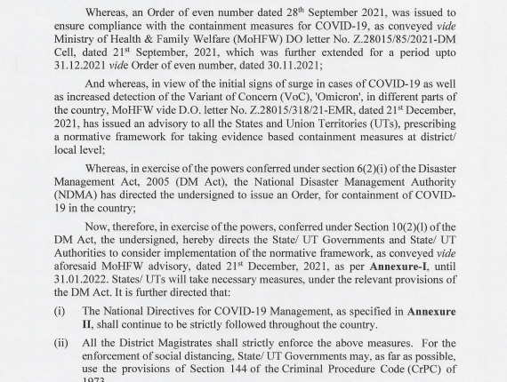 National Directives for COVID-19 management to continue to be strictly followed throughout the country till 31st January 2022: Ministry of Home Affairs to States/UTs Nation By Editor Last updated Dec 27, 2021 110 Share 110 Share