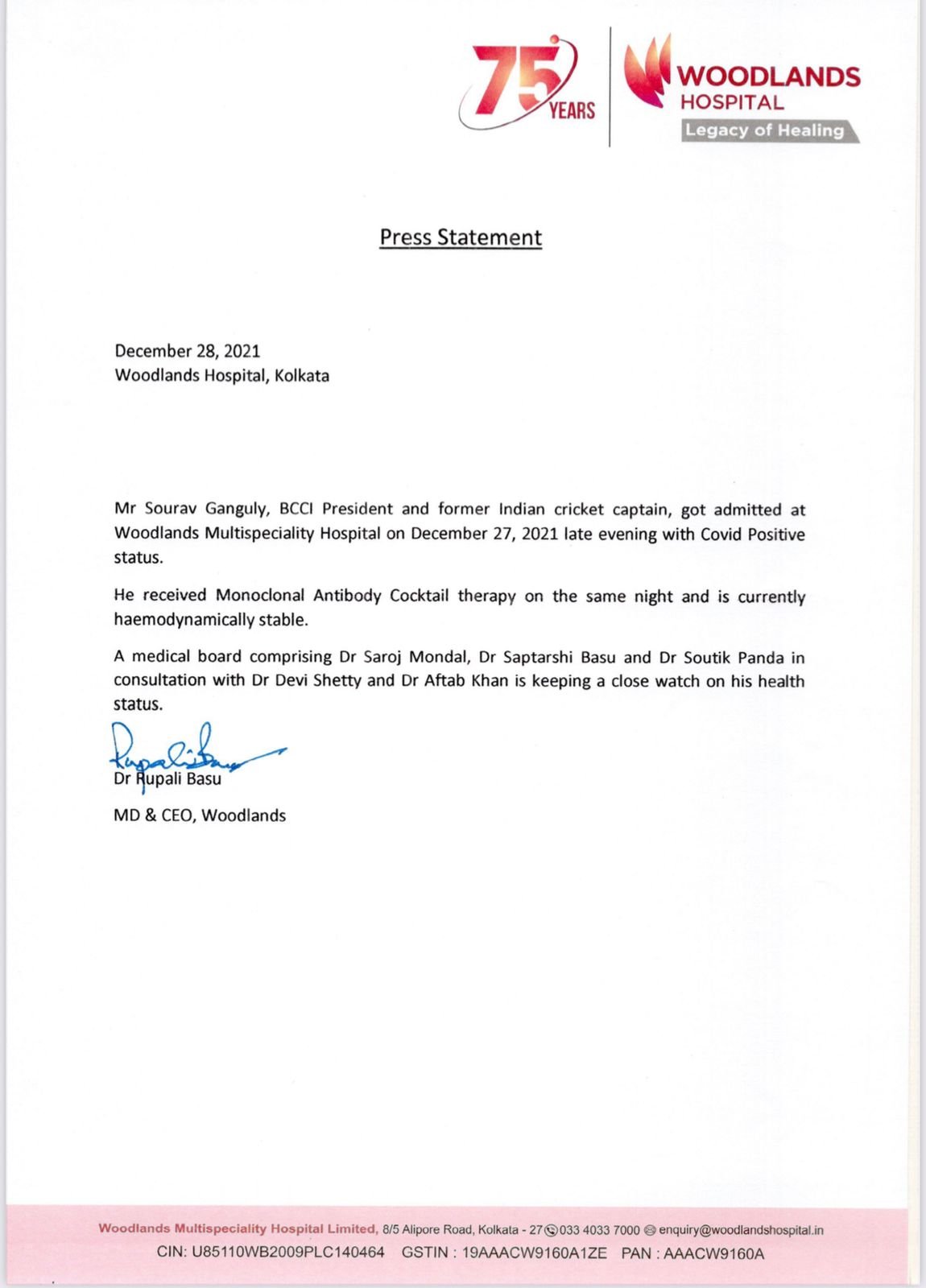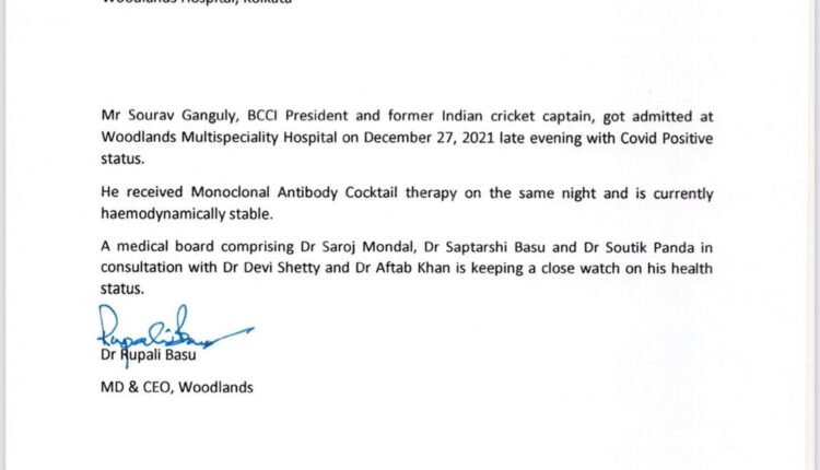 Sourav Ganguly, BCCI President, got admitted at Woodlands Multispeciality Hospital on Dec 27 with Covid status. He received monoclonal anti-body cocktail therapy and is currently stable: Dr Rupali Basu MD & CEO, Woodlands Hospital, Kolkata Nation By Editor Last updated Dec 28, 2021 162 Share 162 Share