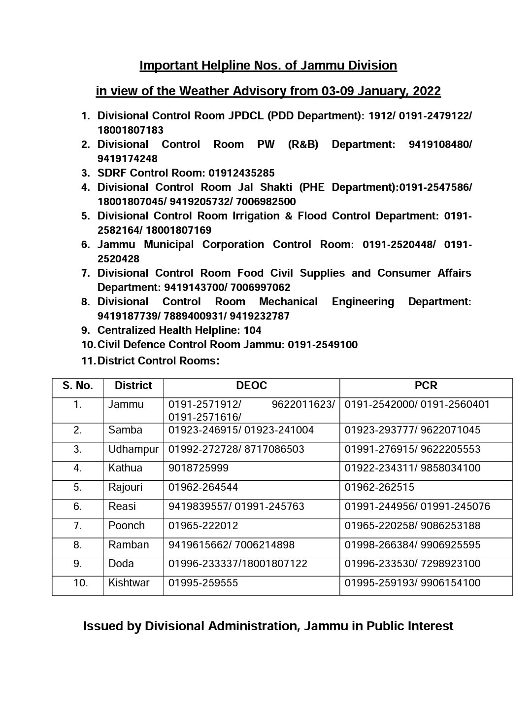 Divisional Administration Jammu has issued list of important helpline numbers of Jammu division in view of weather advisory from Jan 3 to 9, 2022. J&K / Ladakh By Editor Last updated Jan 4, 2022 201 Share 201 Share