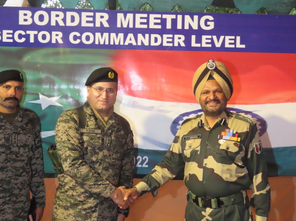 The BSF delegation was led by Surjit Singh, DIG Border Security Force and Pakistan delegation was led by Brigadier Fahd, Sialkot Sector Commander Pakistan Rangers. This was the first sector level commander level meeting in the year 2022.