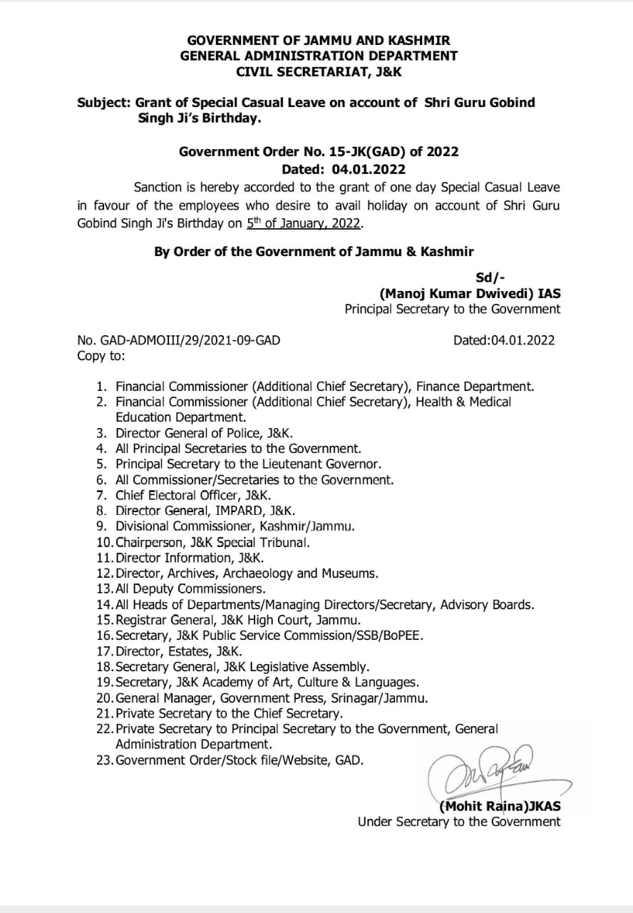 J&K Govt sanctions one day Special casual leave in favour of Employees who desire to avail holiday on account of Shri Guru Gobind Singh Ji’s birthday on 5th Jan 2022. J&K / Ladakh By Editor Last updated Jan 5, 2022 676 Share 676 Share