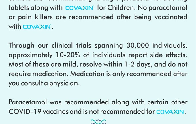 No paracetamol or pain killers are recommended after being vaccinated with Covaxin: Bharat Biotech Nation By Editor Last updated Jan 5, 2022 77 Share 77 Share