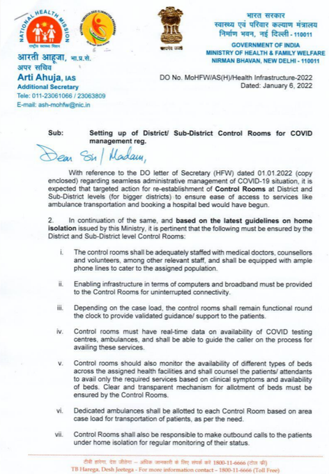Centre writes to states to ensure setting up of district, sub-district control rooms for #COVID management with adequate staff, doctors, infrastructure, monitoring of bed availability, making outbound calls to patients in home isolation. Nation By Editor Last updated Jan 6, 2022 58 Share 58 Share