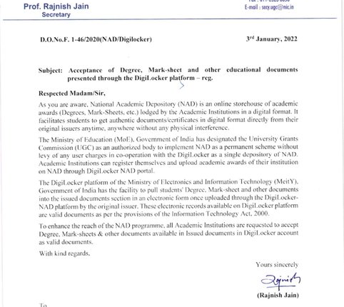 UGC requests all Academic Institutions to accept Degree, Mark-sheets & other documents available in issued documents in DigiLocker account as valid documents: University Grants Commission Nation By Editor Last updated Jan 7, 2022 110 Share 110 Share