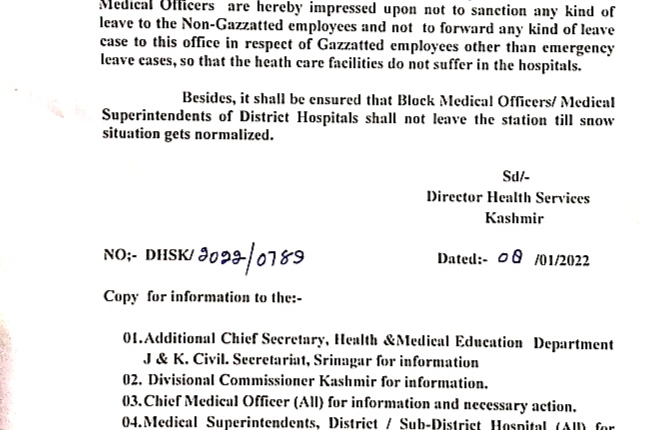 Director health services Kashmir has cancelled leave granted or under consideration to doctors, nurses, paramedical staff and other official, except maternity or that taken in view of extreme medical exigencies. J&K / Ladakh By Editor Last updated Jan 8, 2022 338 Share 338 Share