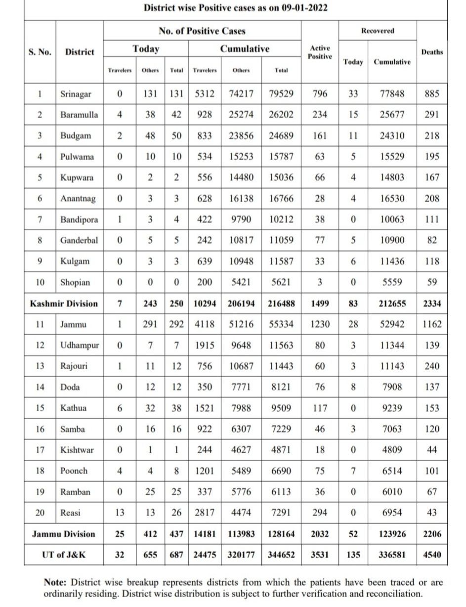 J&K Reports 687 fresh covid-19 cases, 3 deaths J&K / Ladakh By Editor Last updated Jan 9, 2022 71 Share Today’s case in jammu and kashmir 687, Jammu division 437, Kashmir division 250, Total case 344652, Total recovered 336581,Total deaths 4540, Also 03 COVID deaths have been reported from Jammu division. 71 Share