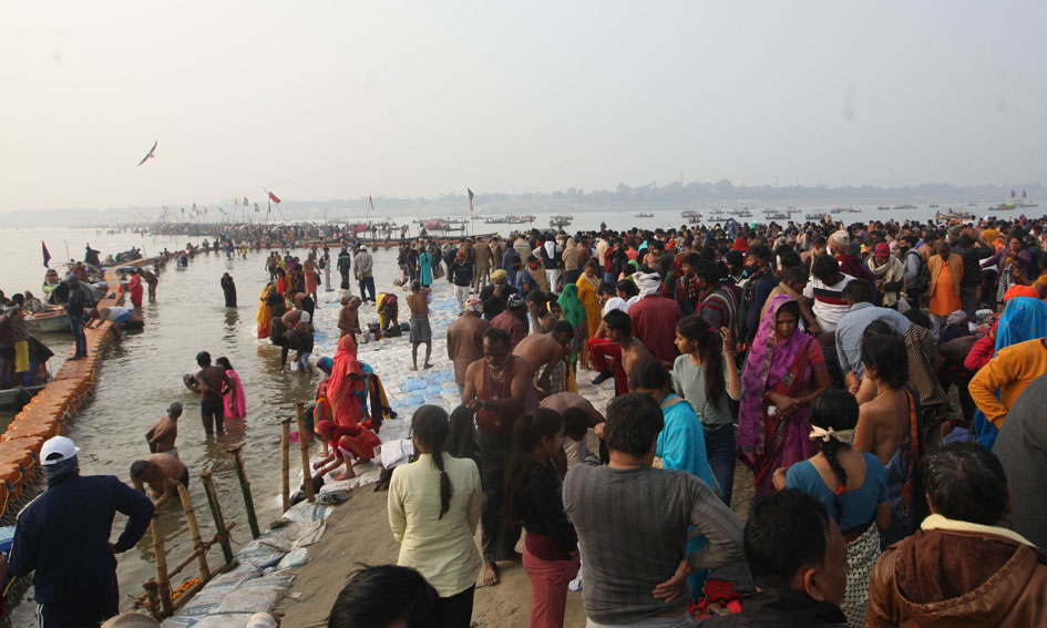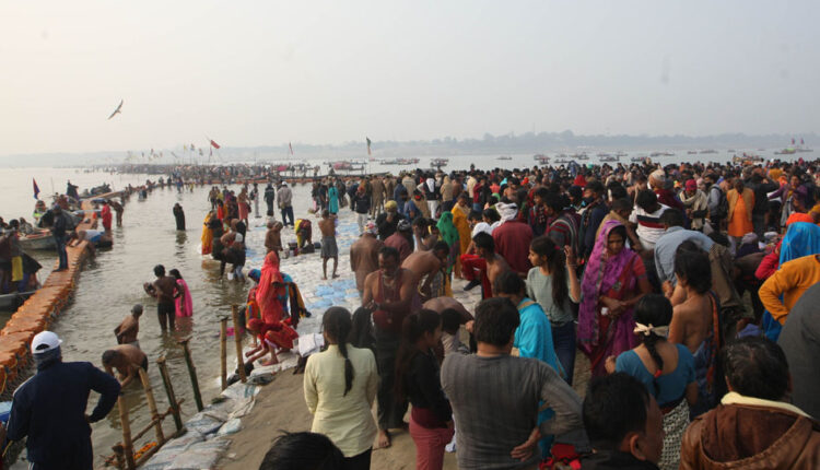 PRAYAGRAJ :- Hindu devotees gather on the banks of Sangam, the confluence of the Ganges, Yamuna and Saraswati rivers to take a holy dip on the occasion of Makar Sankranti during the ongoing Magh Mela festival, in Prayagraj on Friday.