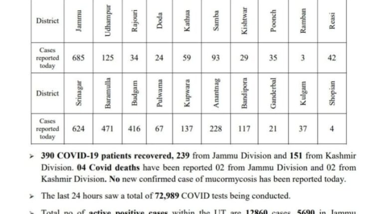 Covid-19 pandemic: Jammu and Kashmir records 3251 new cases (1129 from Jammu Division and 2122 from Kashmir Division), 4 deaths