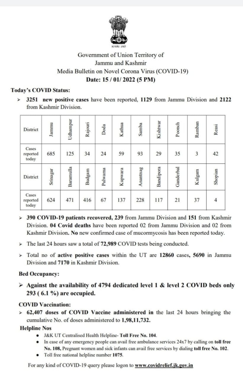 Today’s case in Jammu and Kashmir 3251, Jammu division 1129, Kashmir division 2122, Total case 355874, Total recovered 338453, Total deaths 4561, Also 04 COVID deaths have been reported, 02 from Jammu division and 02 from Kashmir division.