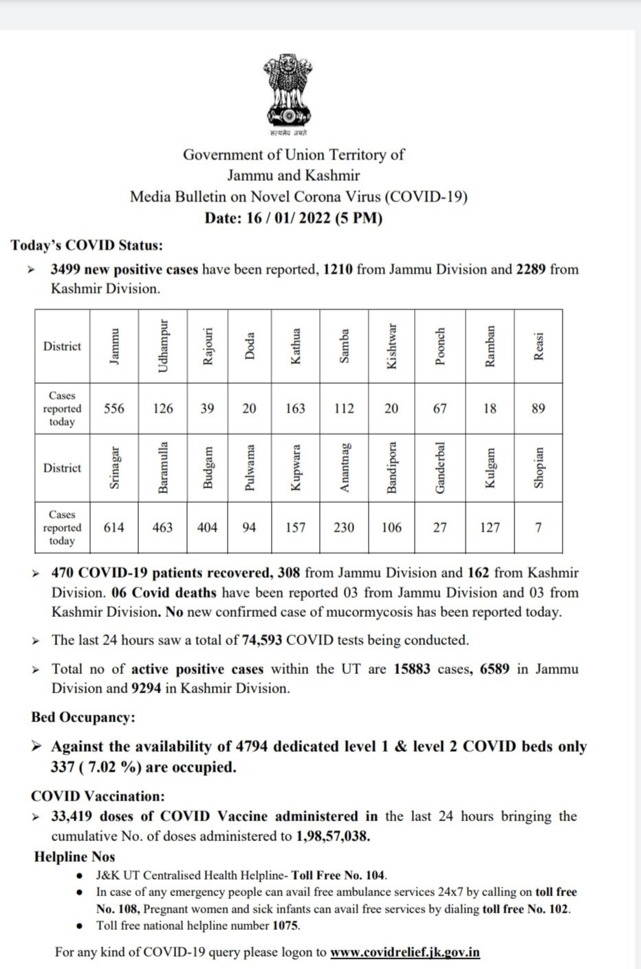 Today’s case in Jammu and Kashmir 3499, Jammu division 1210, Kashmir division 2289, Total case 359373, Total recovered 338923, Total deaths 4567, Also 06 COVID deaths have been reported, 03 from Jammu division and 03 from Kashmir division.