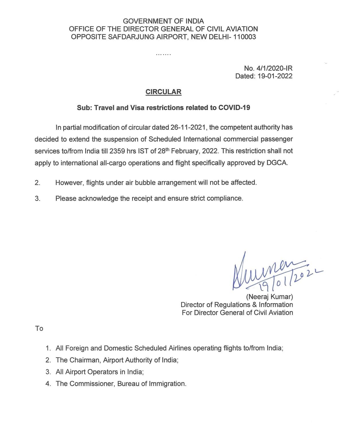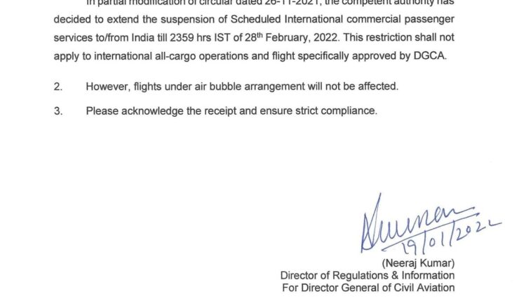 “The authority has decided to extend the suspension of Scheduled International commercial passenger services to/from India till 2359 hrs IST of 28th February 2022,” reads an official letter of Civil Aviation Nation By Editor Last updated Jan 19, 2022 132 Share 132 Share