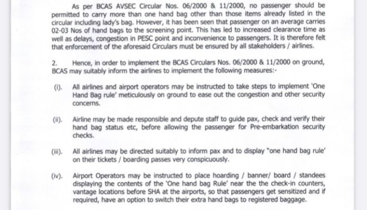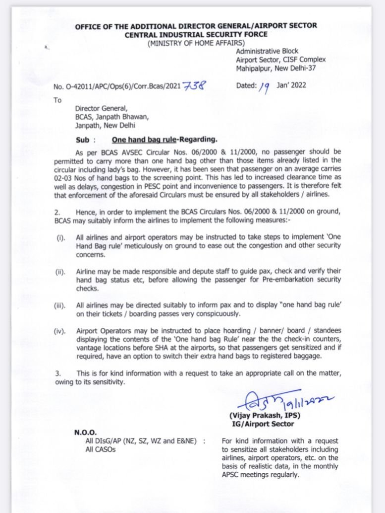 All airlines and airport operators may be instructed to take steps to implement the ‘One Hand Bag rule’ meticulously on the ground to ease out the congestion and other security concerns: CISF IG (airport sector) Vijay Prakash in a letter to DG, Bureau of Civil Aviation Security
