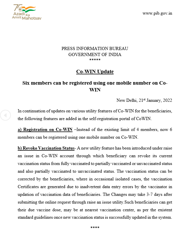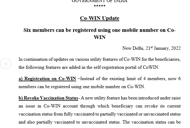 Instead of the existing limit of 4 members, now 6 members can be registered using one mobile number on Co-WIN: Government of India Nation By Editor Last updated Jan 21, 2022 64 Share 64 Share