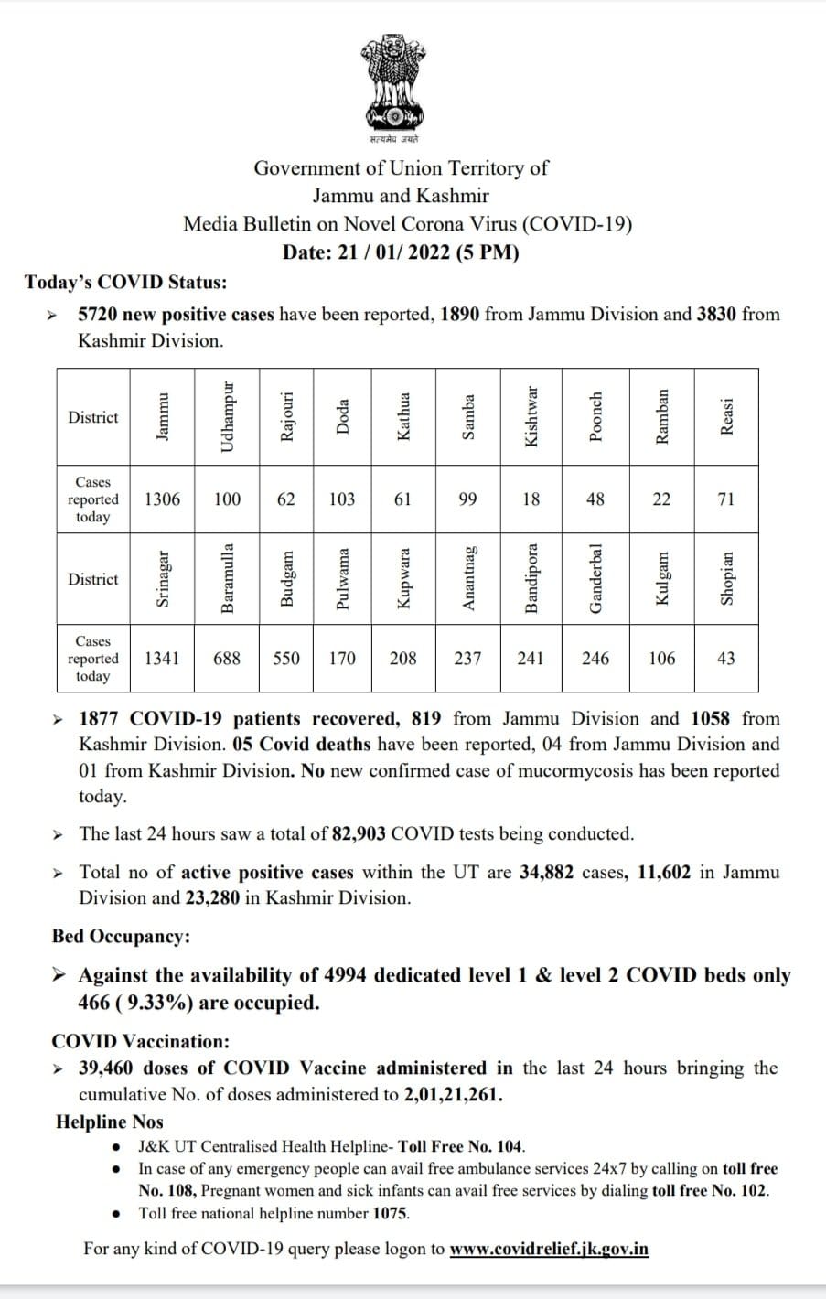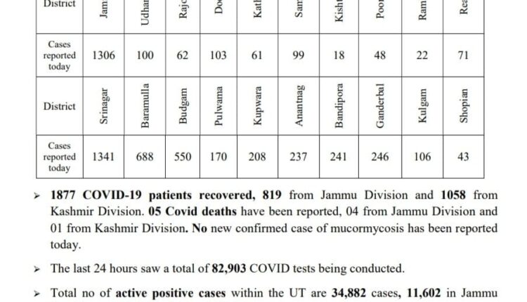Today’s case in Jammu and Kashmir 5720, Jammu division 1890, Kashmir division 3830, Total case 384381, Total recovered 344908, Total deaths 4591, Also 05 COVID deaths have been reported, 04 from Jammu division and 01 from Kashmir division.