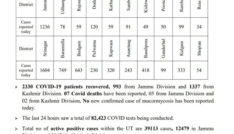 Today’s case in Jammu and Kashmir 6568, Jammu division 1875, Kashmir division 4693, Total case 390949, Total recovered 347238, Total deaths 4598, Also 07 COVID deaths have been reported, 05 from Jammu division and 02 from Kashmir division.
