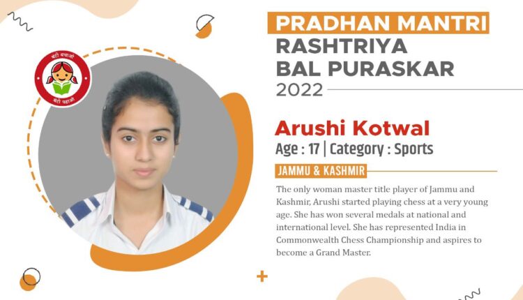 Arushi Kotwal from Jammu & Kashmir conferred with the prestigious Pradhan Mantri Rashtriya Bal Puraskar 2022 by PM Narendra Modi for her exceptional achievements in the field of Sports (Chess) J&K / Ladakh By Editor Last updated Jan 25, 2022 671 Share 671 Share