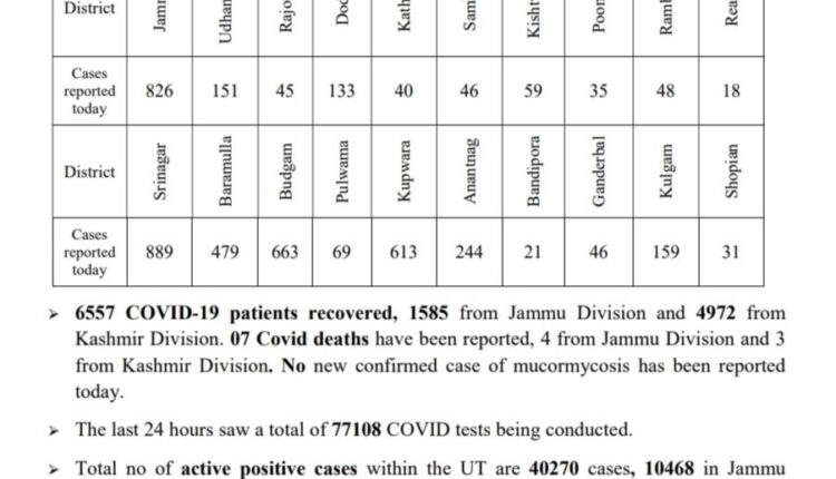 Today’s case in Jammu and Kashmir 4615, Jammu division 1401, Kashmir division 3214, Total case 432875, Total recovered 387946, Total deaths 4659, Also 07 COVID deaths have been reported, 04 from Jammu division and 03 from Kashmir division.