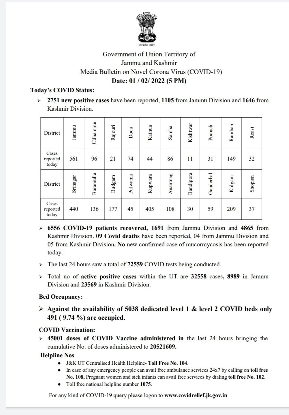 Today’s case in Jammu and Kashmir 2751, Jammu division 1105, Kashmir division 1646, Total case 438176, Total recovered 400935, Total deaths 4683, Also 09 COVID deaths have been reported, 04 from Jammu division and 05 from Kashmir division.
