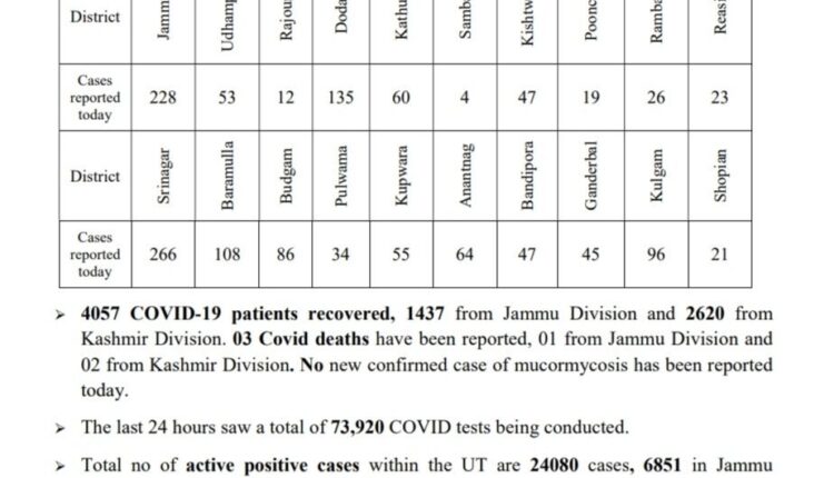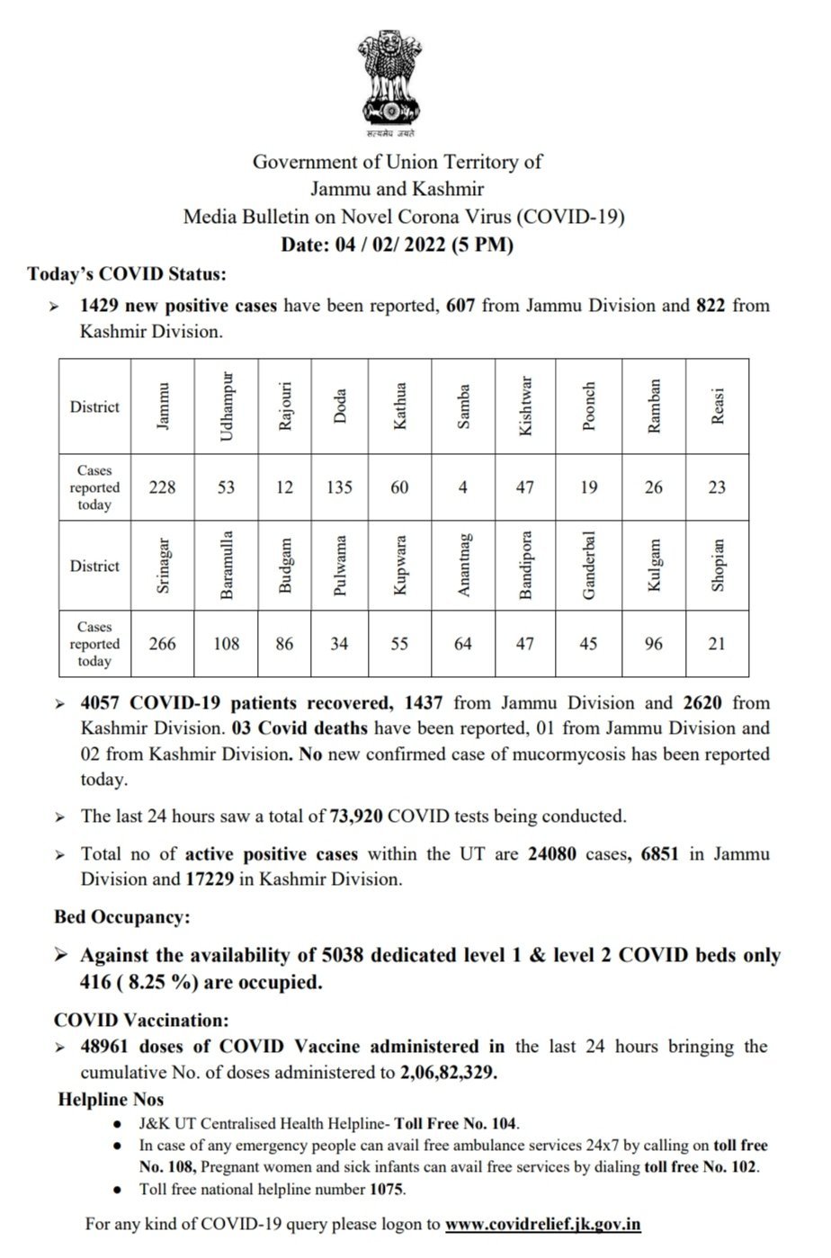Today’s case in Jammu and Kashmir 1429, Jammu division 607, Kashmir division 822, Total case 443891, Total recovered 415109, Total deaths 4702, Also 03 COVID deaths have been reported, 01 from Jammu division and 02 from Kashmir division.