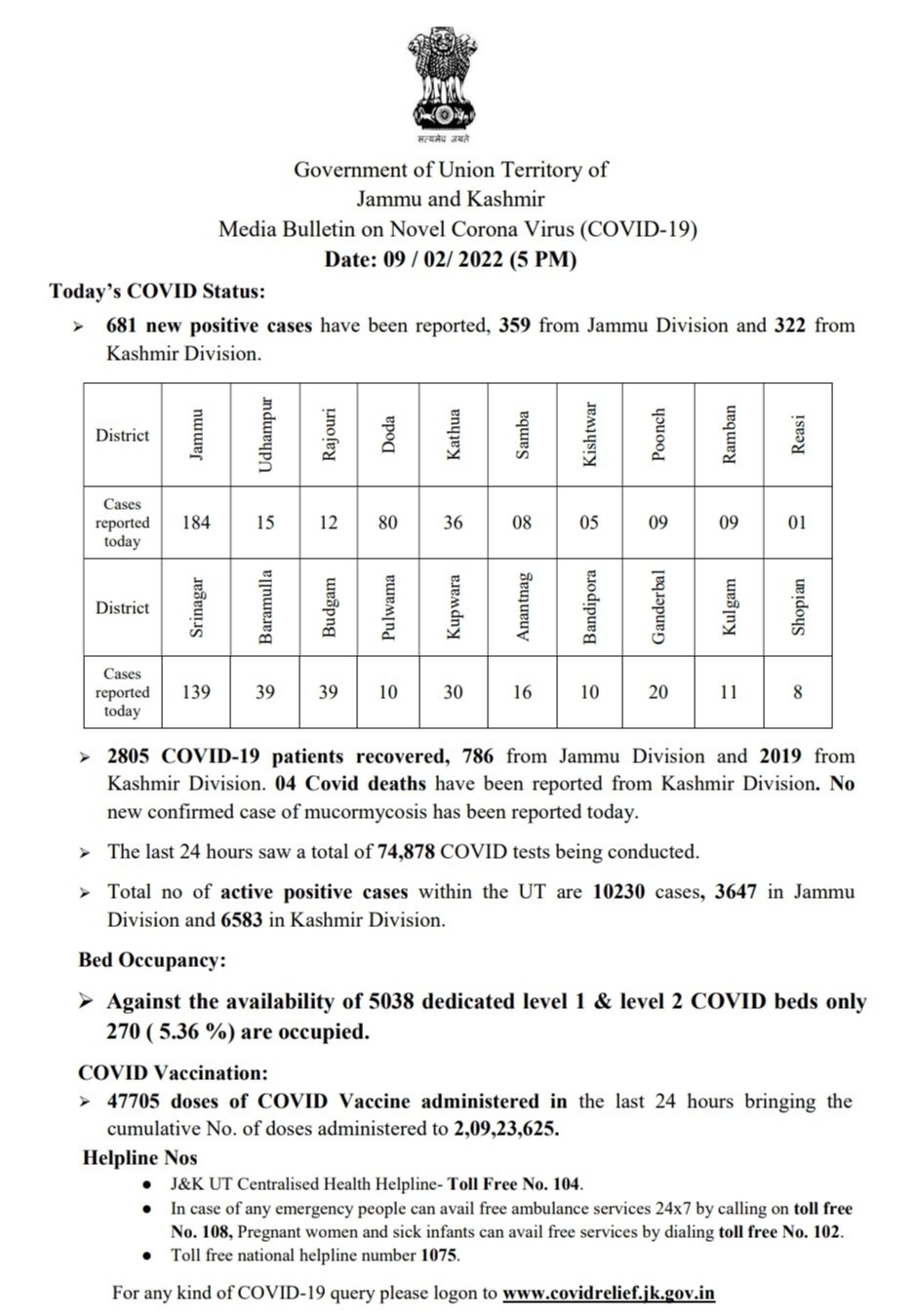 Today’s case in Jammu and Kashmir 681, Jammu division 359, Kashmir division 322, Total case 448786, Total recovered 433824, Total deaths 4732, Also 04 COVID deaths have been reported from Kashmir division.