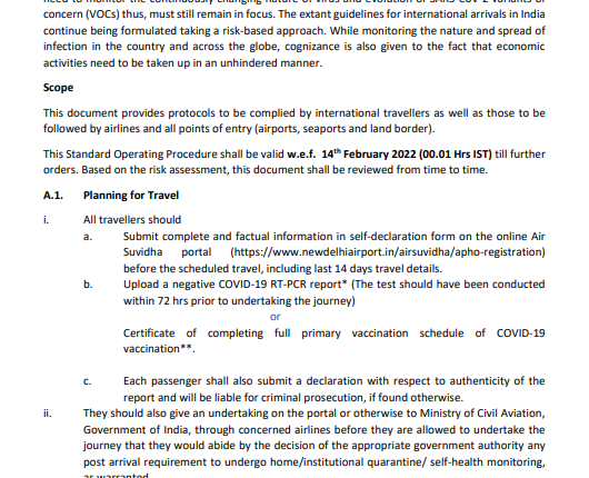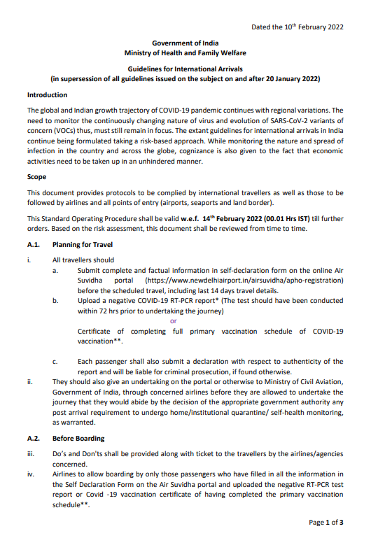 Ministry of Health issues revised guidelines for international arrivals, to come in effect from 14th Feb
