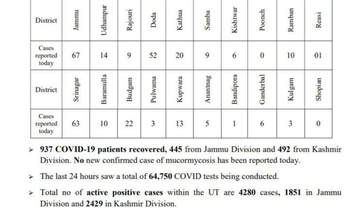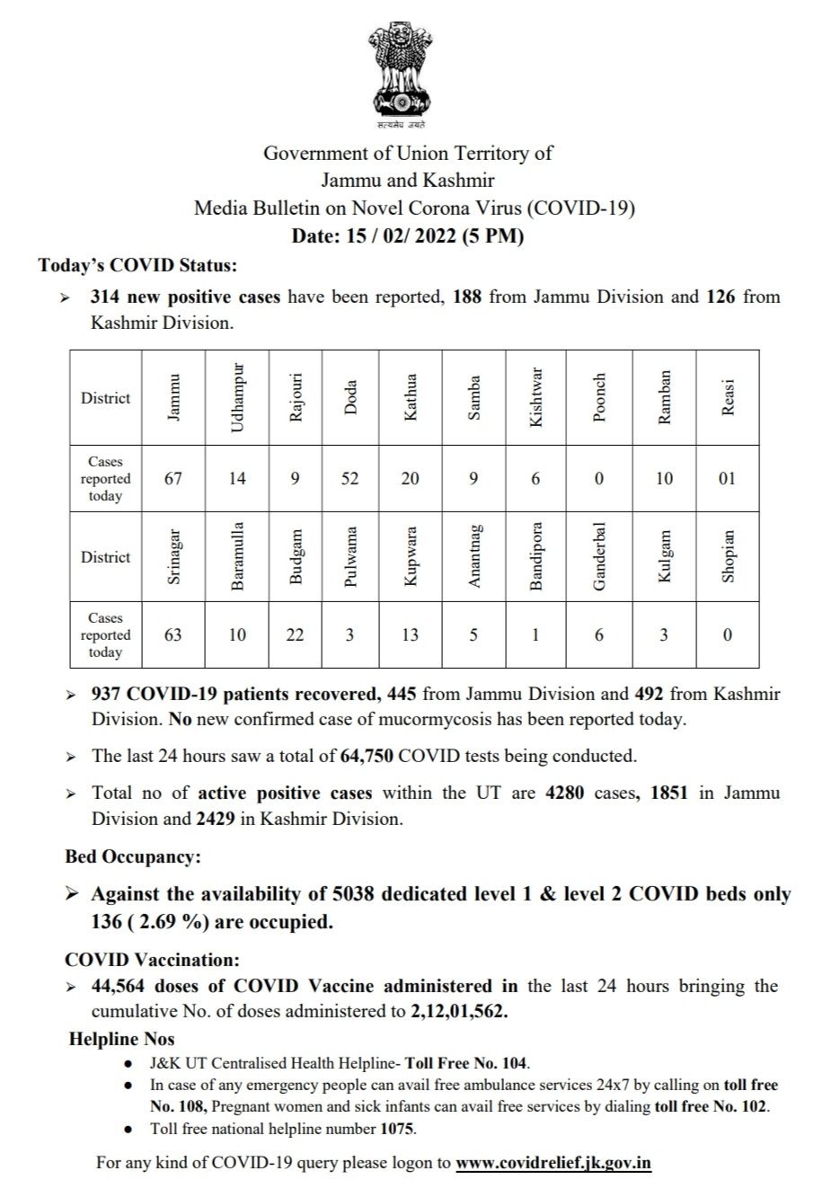 Jammu and Kashmir reports 314 fresh Covid-19 cases (188 from Jammu Division and 126 from Kashmir Division) J&K / Ladakh By Editor Last updated Feb 15, 2022 113 Share Today’s case in Jammu and Kashmir 314, Jammu division 188, Kashmir division 126, Total case 451330, Total recovered 442305, Total deaths 4745. 113 Share