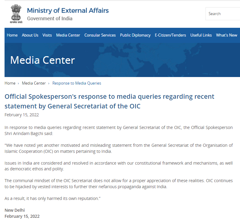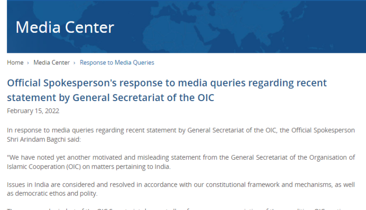 We have noted yet another motivated & misleading statement from the General Secretariat of OIC on matters pertaining to India. Issues in India are considered and resolved in accordance with our constitutional framework and mechanisms, as well as democratic ethos and polity: MEA