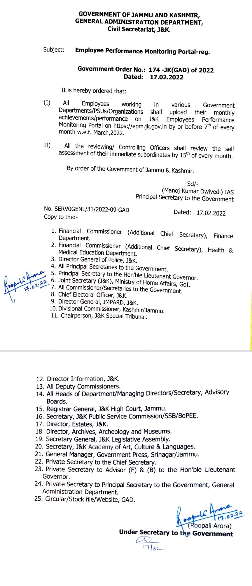J&K GOVT: All employees working in Govt Departments /PSUs asked to upload their monthly Achievements on Employees Monitoring Portal by 7th of every month. The reviewing officers shall review the same by 15th of every month J&K / Ladakh By Editor Last updated Feb 17, 2022 621 Share 621 Share