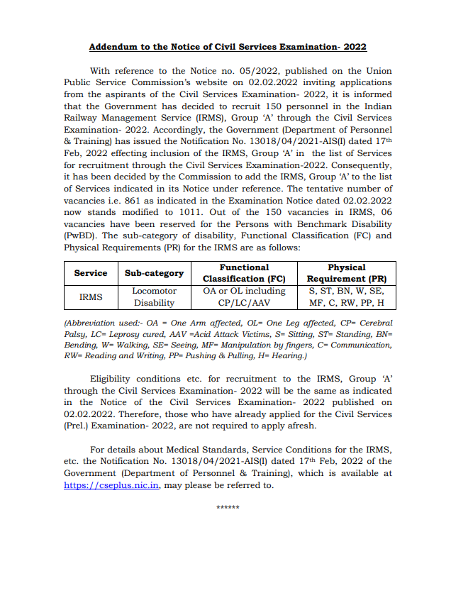 • Government to recruit 150 personnel for Indian Railway Management Service (IRMS) Group ‘A’ through Civil Services Examination, 2022