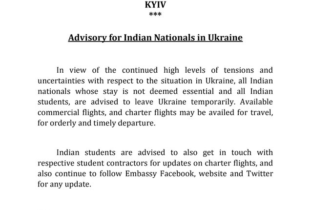 In view of continued tensions in #Ukraine, all Indian nationals whose stay is not deemed essential and all Indian students are advised to leave Ukraine temporarily. Indian students are advised to also get in touch with respective student contractors for updates on charter flights