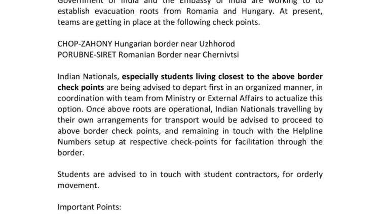 #RussiaUkraineConflict | Govt of India & Embassy of India working to establish evacuation routes from Romania & Hungary. At present, teams are getting in place at CHOP-ZAHONY Hungarian border near Uzhhorod, PORUBNE-SIRET Romanian Border near Chernivtsi: Indian Embassy in Hungary
