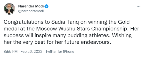 Prime Minister Narendra Modi congratulates Sadia Tariq on winning the Gold medal at the Moscow Wushu Stars Championship Nation By Editor Last updated Feb 26, 2022 228 Share 228 Share