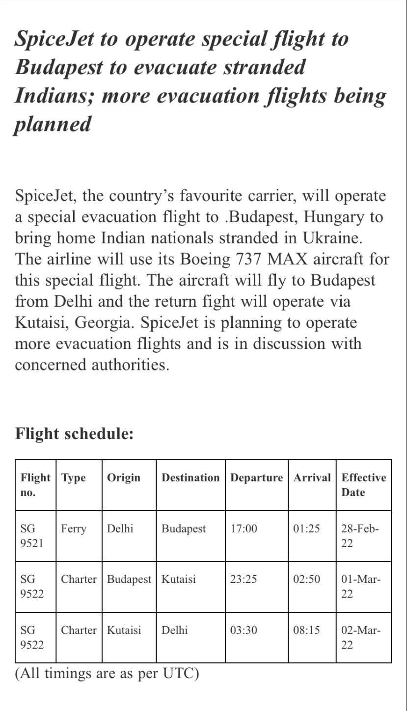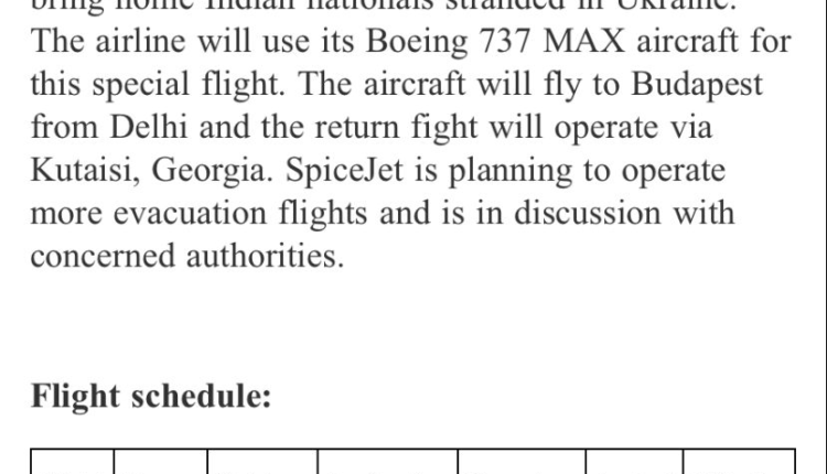 SpiceJet will operate a special evacuation flight to Budapest, Hungary to evacuate Indian nationals stranded in Ukraine and bring them home. Nation By Editor Last updated Feb 28, 2022 103 Share 103 Share