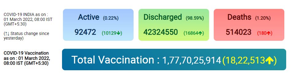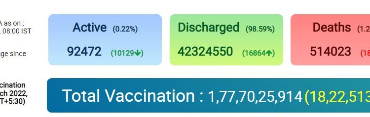 COVID19 | India reports 6,915 new cases, 180 deaths and 16,864 recoveries; Active caseload stands at 92,472 Nation By Editor Last updated Mar 1, 2022 63 Share 63 Share