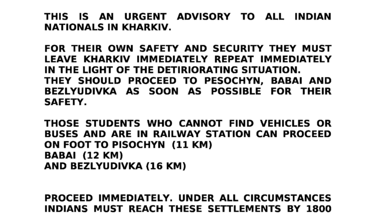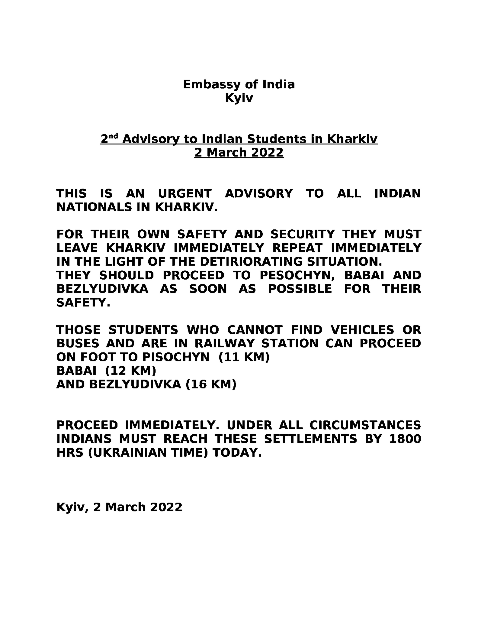 Urgent #Advisory To All Indian Nationals In #Kharkiv. “They Must Leave Kharkiv Immediately. Proceed To Pesochin, Babaye & Bezlyudovka ASAP. Under All Circumstances, They Must Reach By 1800 Hrs (Ukrainian Time) Today.”