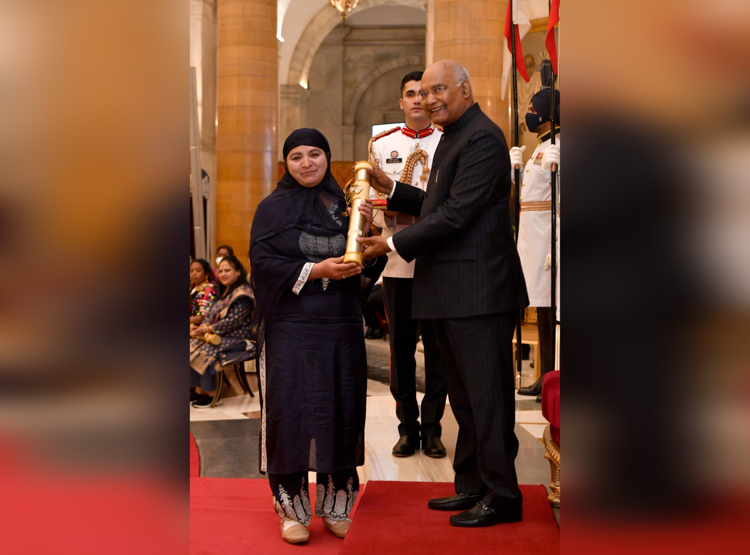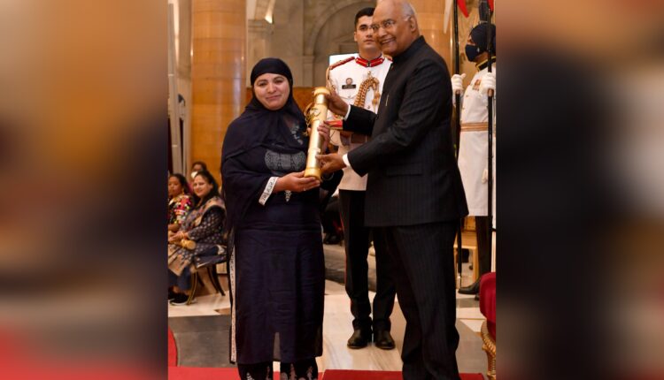 President Kovind presented Nari Shakti Puraskar to Nasira Akhter for grassroot innovation in environmental conservation. Hailing from Kulgam, #JammuAndKashmir, she developed a herb that converts polythene to ashes, thereby making polythene biodegradable.
