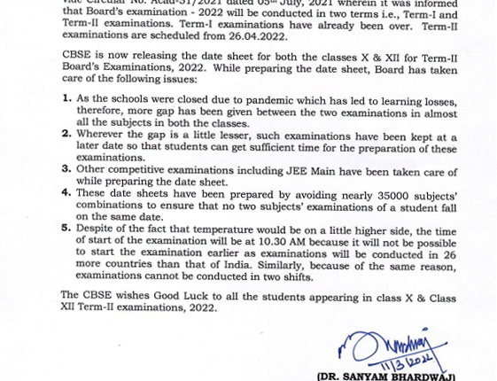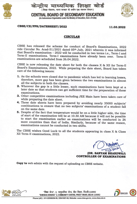 Term-II examinations for classes 10 and 12 to be held from April 26, 2022. This time exam timings will be 10:30 am and won’t be conducted in two shifts. Further details available on the official website: CBSE