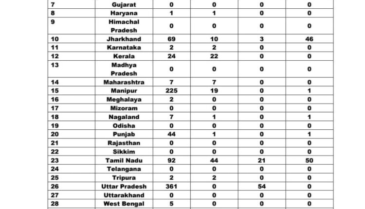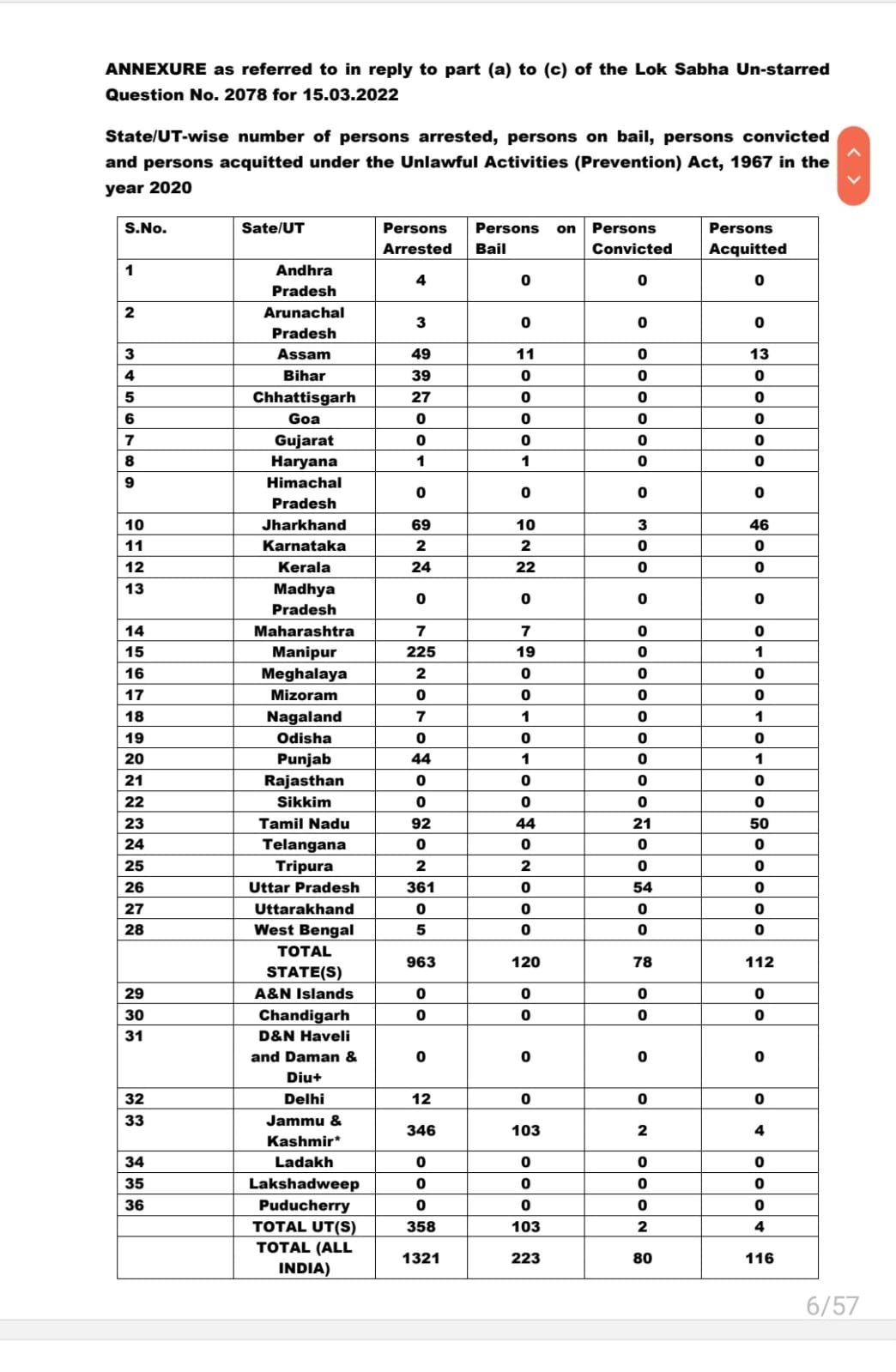 State/UT-wise number of persons arrested, persons on bail, persons convicted and persons acquitted under the Unlawful Activities (Prevention) Act, 1967 in the year 2020: MoS Home Nityanand Rai in Lok Sabha