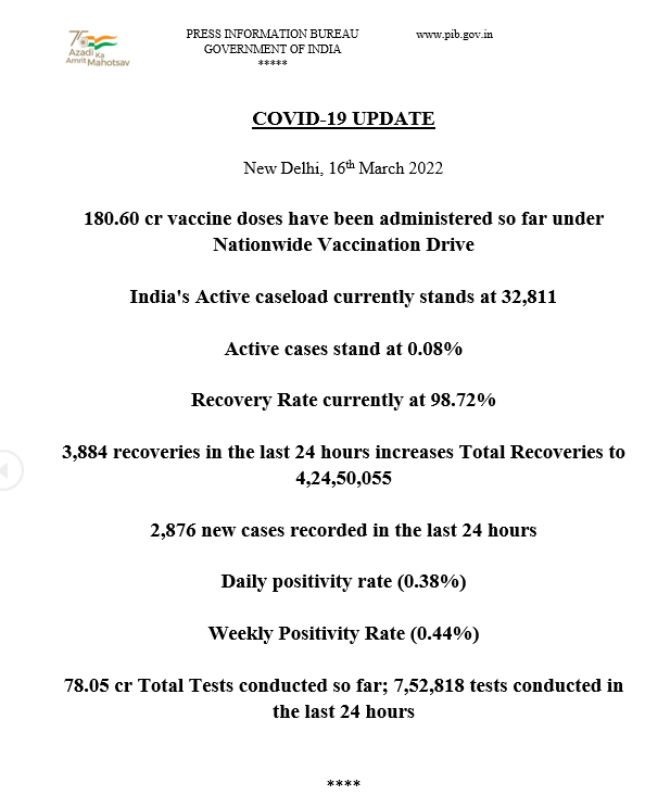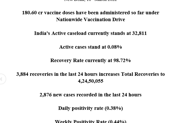 India reports 2,876 fresh #COVID19 cases, 3,884 recoveries, and 98 deaths in the last 24 hours. Nation By Editor Last updated Mar 16, 2022 131 Share Active case: 32,811 (0.08%)Daily positivity rate: 0.38%Total recoveries: 4,24,50,055Death toll: 5,16,072 Related Posts UP Cobbler rejects Rs 10 lakh offer for slipper stitched by… Aug 1, 2024 Punjab Police bust international drug racket, arrest two… Jul 28, 2024 Sharp decline in terror related incidents in J&K; says… Jul 24, 2024 Total vaccination: 1,80,60,93,107 131 Share