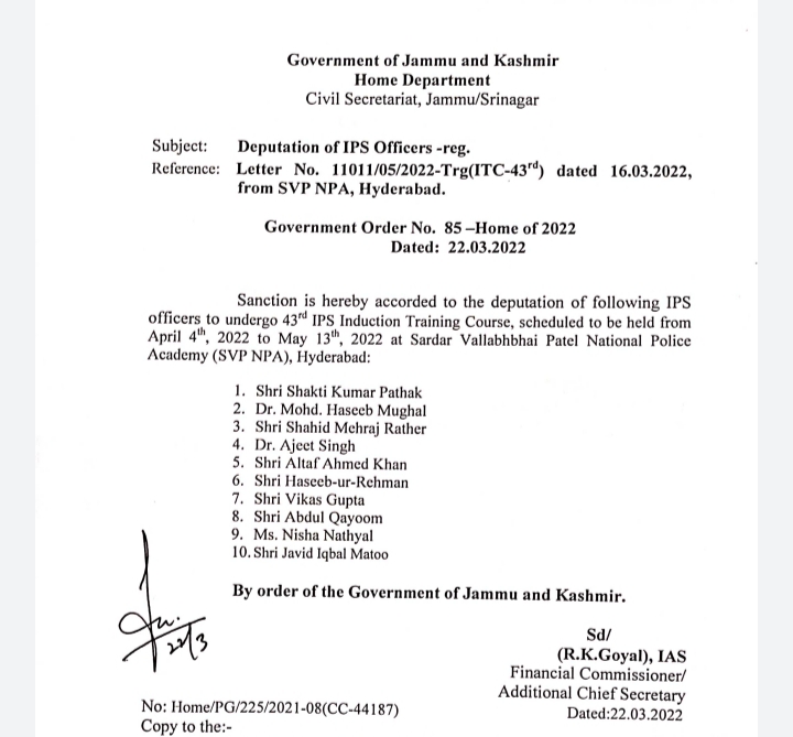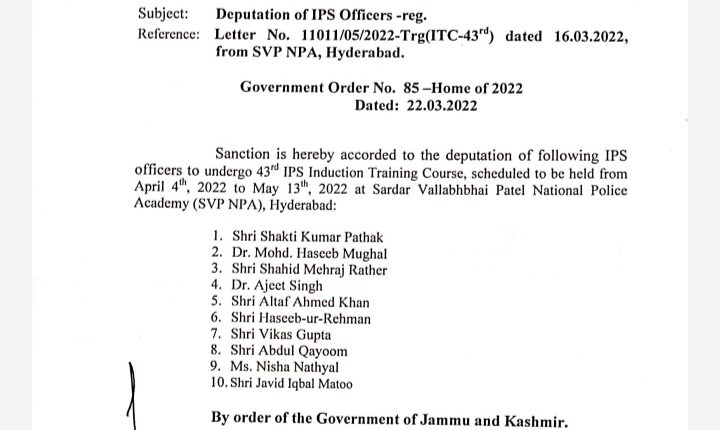 Jammu: 10 IPS Officers deputed for Induction Training Course from April 4 to May 13,2022 at Sardar Vallabhbhai Patel National Police Academy (SVPNPA) Hyderabad J&K / Ladakh By Editor Last updated Mar 22, 2022 686 Share 686 Share